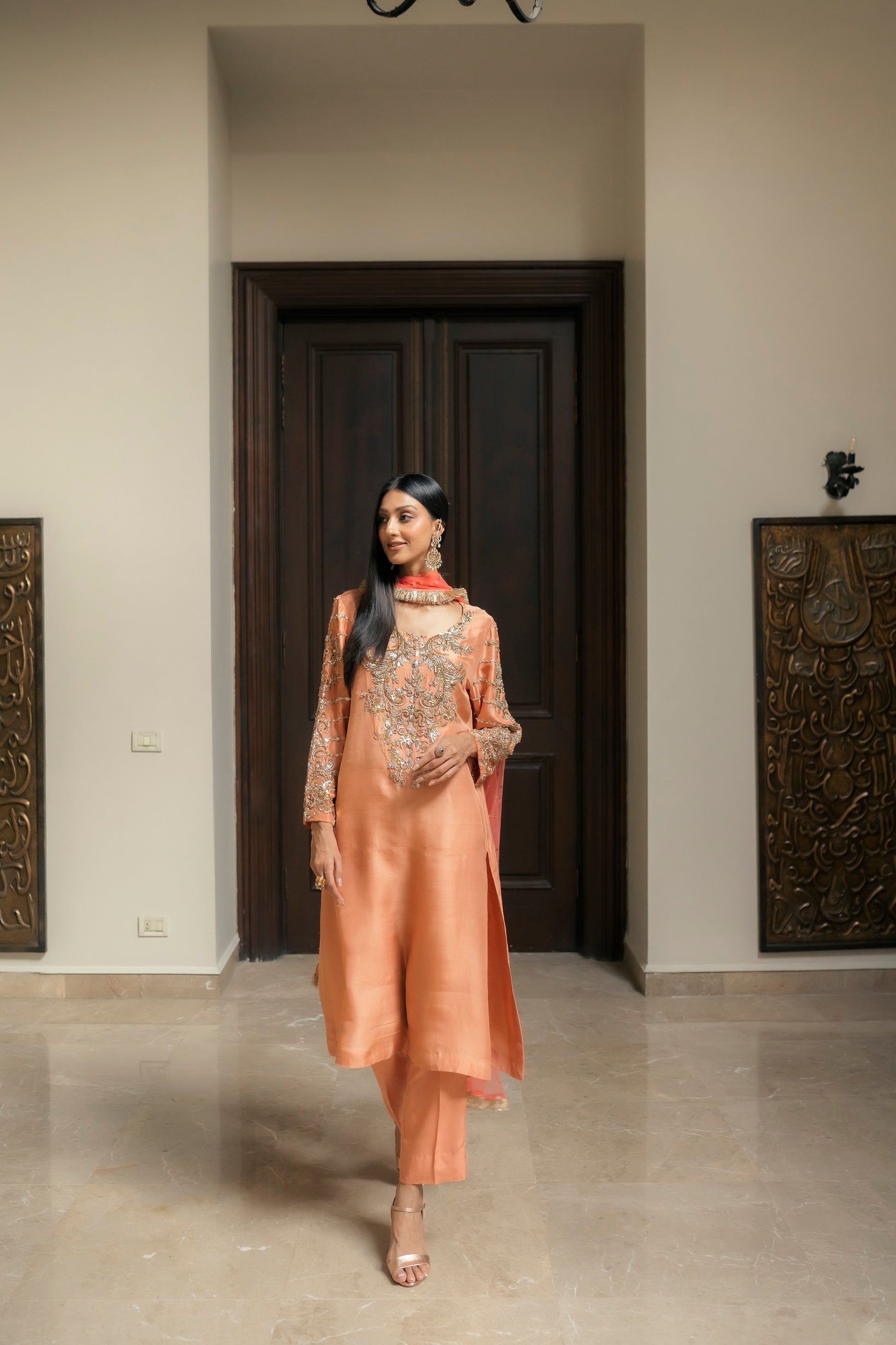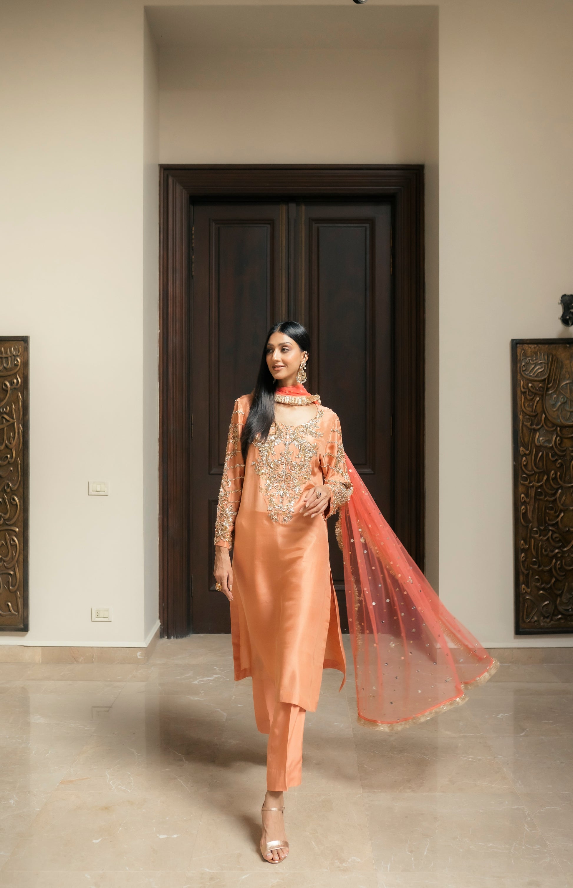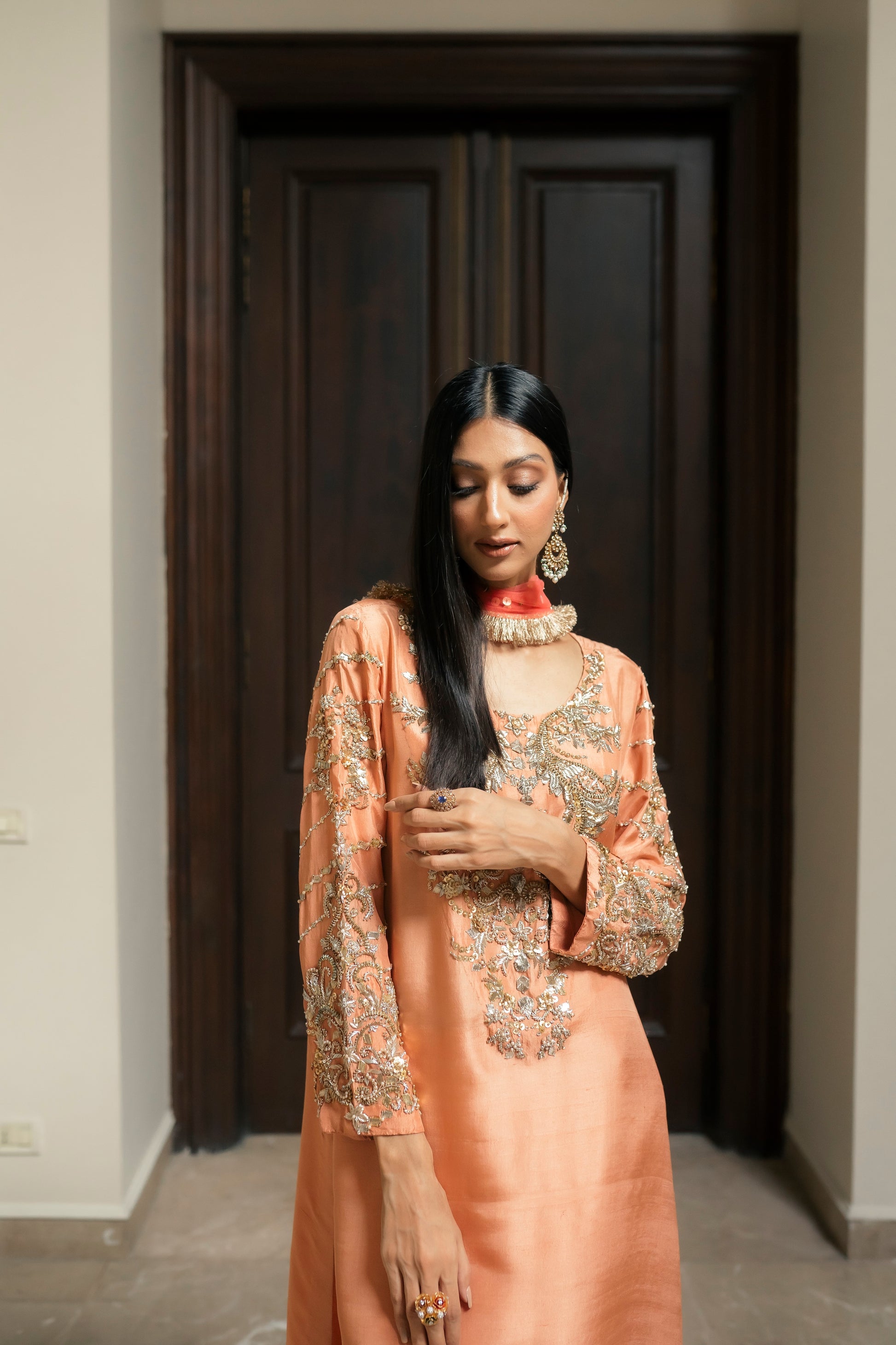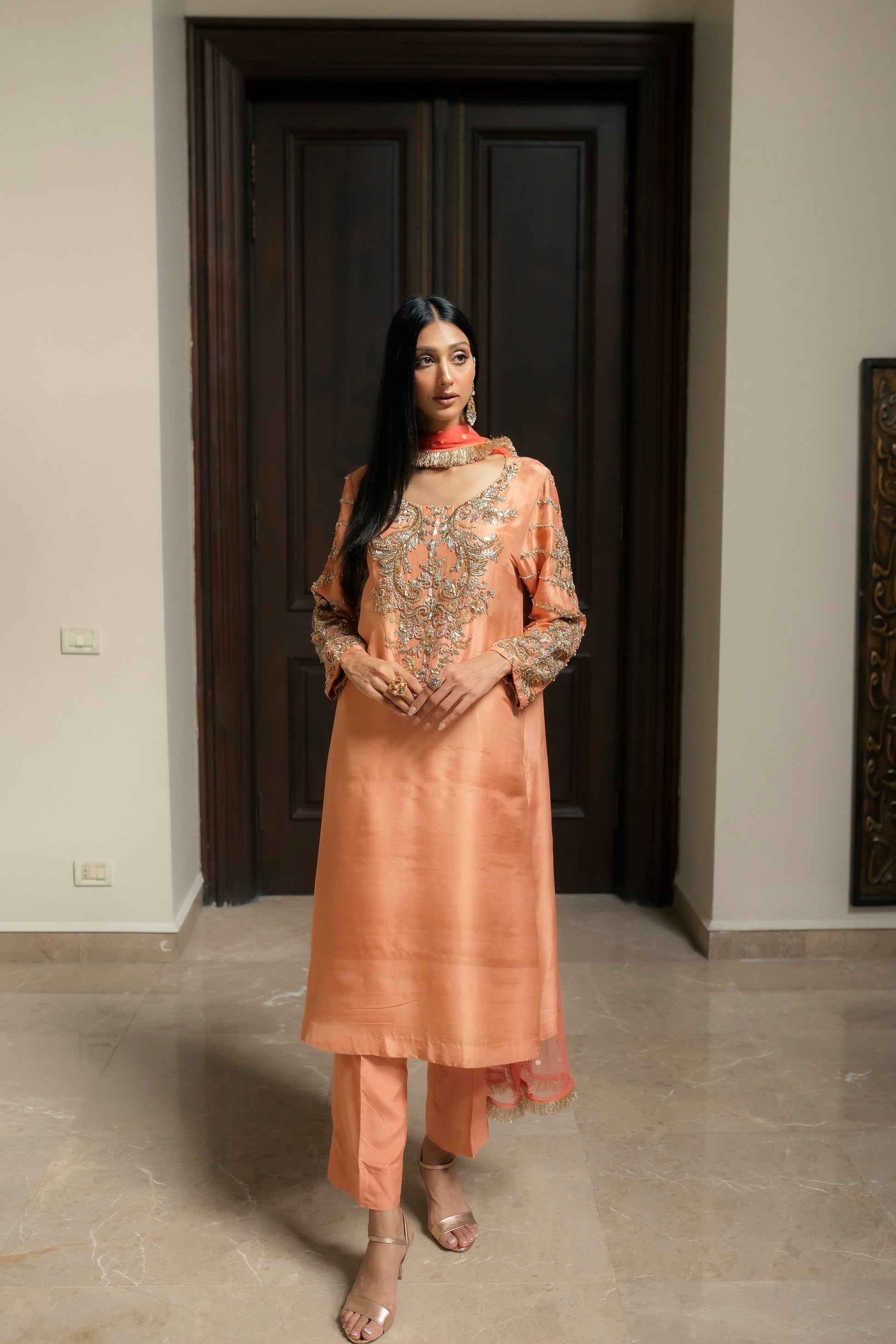 Enjoy the opulent presence of the peach and coral duo. The top and pants, made from the finest pure silk, exude style and grace. The garment combines gota, and a hint of beads with ganga jamni embroidery. With its delicatetely embellished neckline and sleeves, the garment's flow goes above and beyond brilliance. When worn with a light festive coral net dupatta, this refined ensemble conveys an air of grandeur and enchantment.