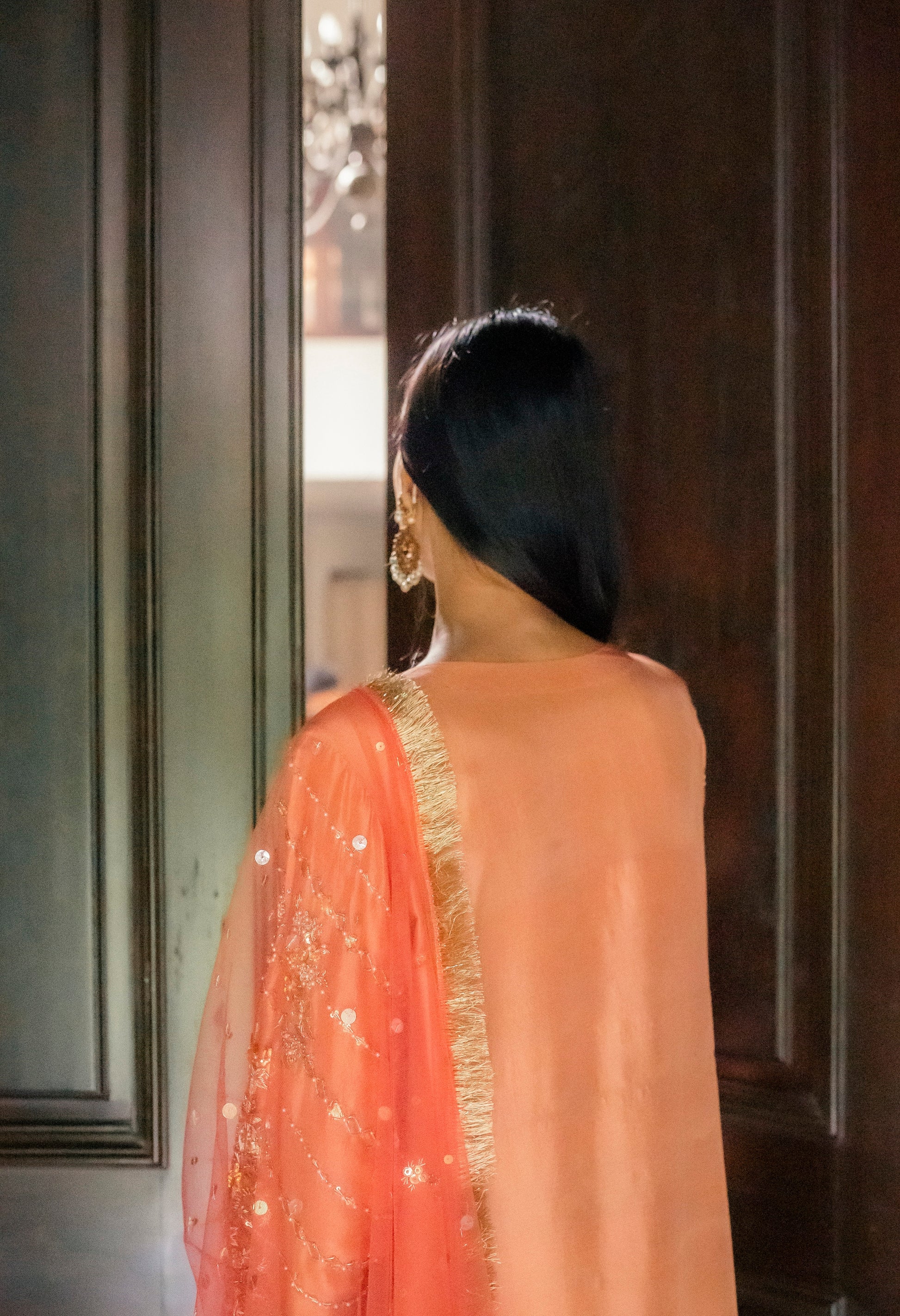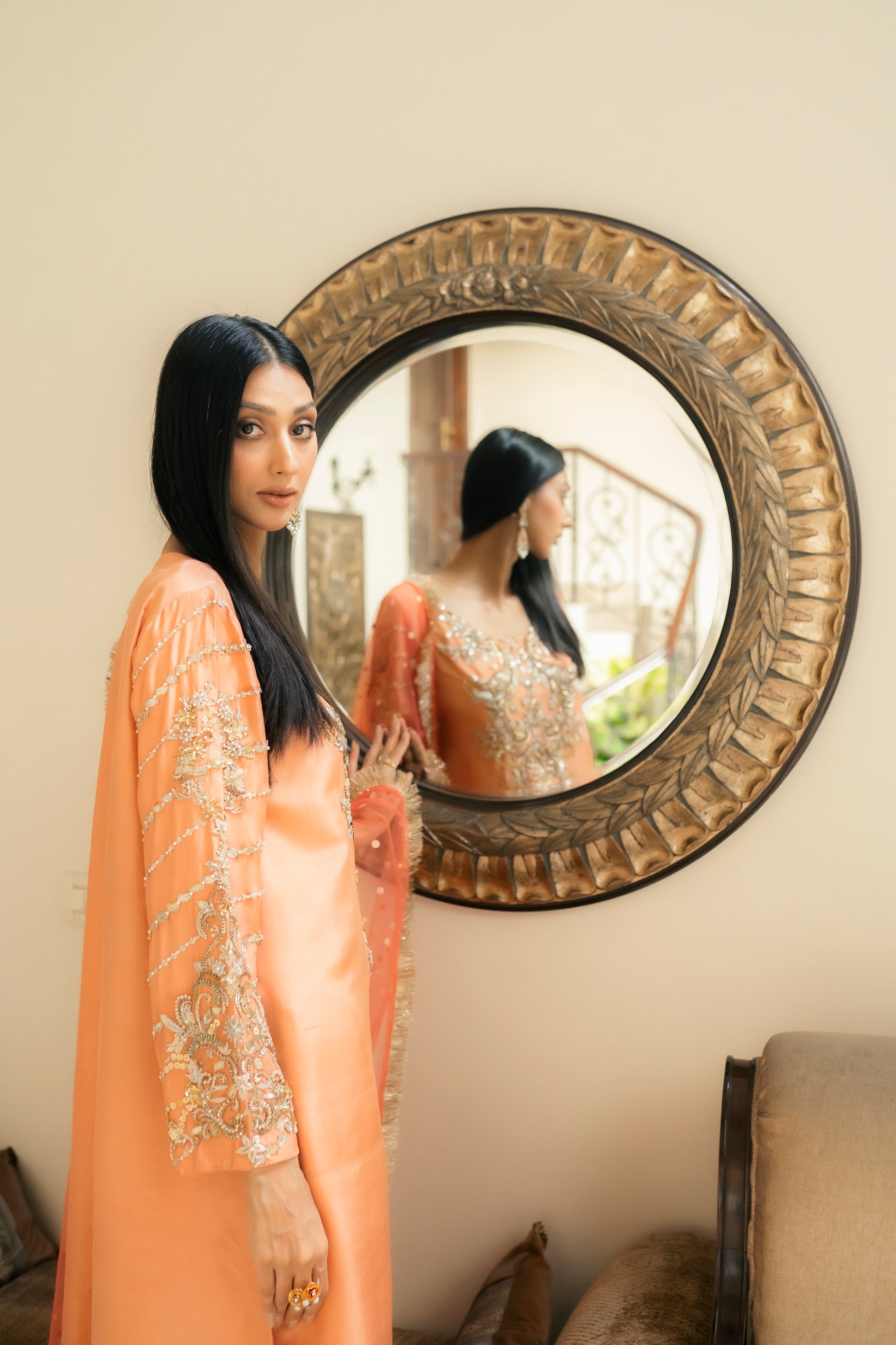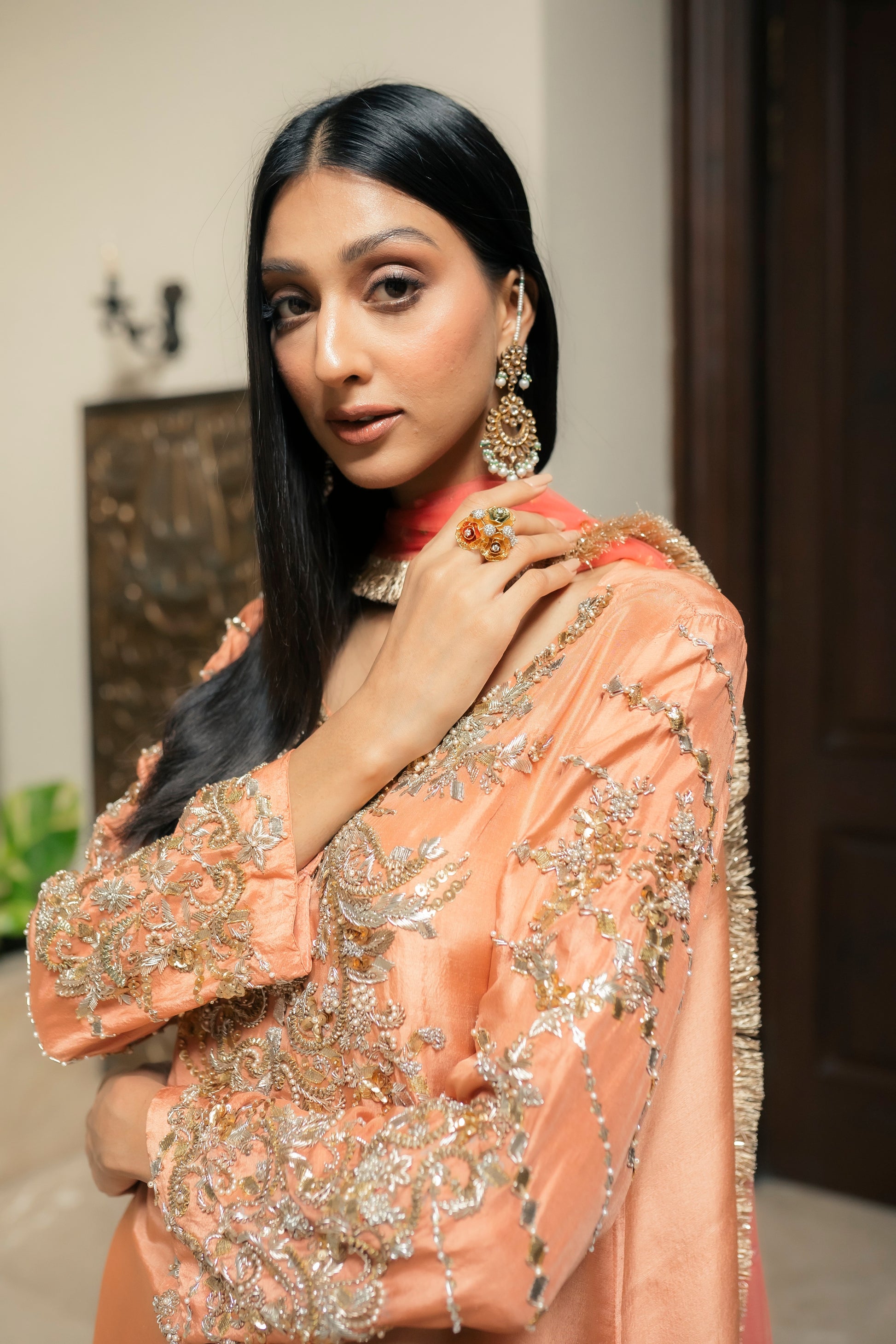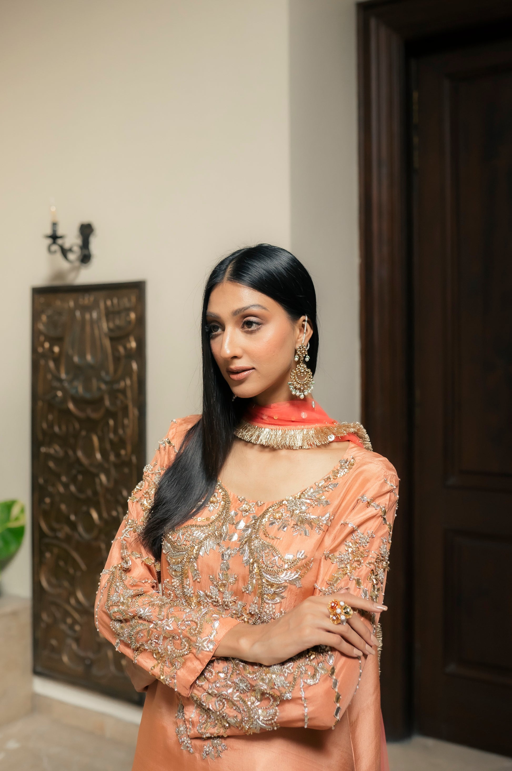 Enjoy the opulent presence of the peach and coral duo. The top and pants, made from the finest pure silk, exude style and grace. The garment combines gota, and a hint of beads with ganga jamni embroidery. With its delicatetely embellished neckline and sleeves, the garment's flow goes above and beyond brilliance. When worn with a light festive coral net dupatta, this refined ensemble conveys an air of grandeur and enchantment.